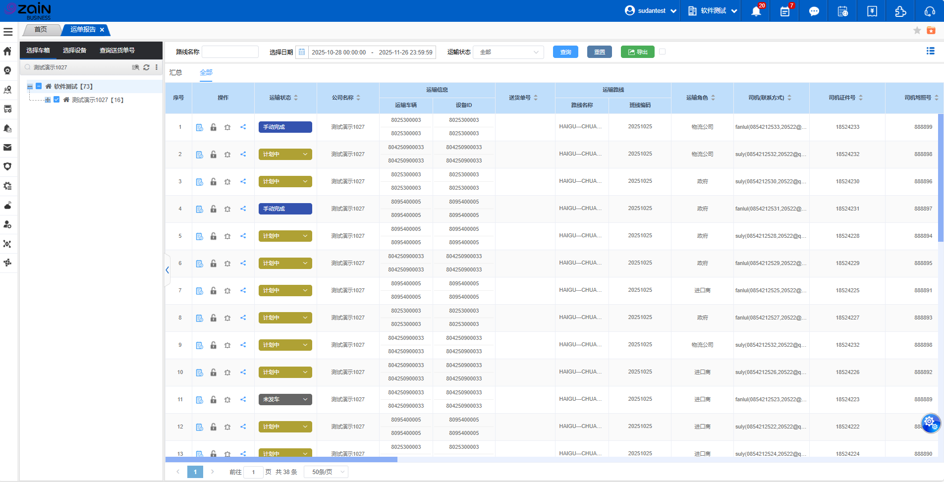 快速检索:在顶部搜索框输入「公司名称」或「设备相关信息」(如设备 ID、车辆编号),系统自动模糊匹配,快速定位目标运单信息。