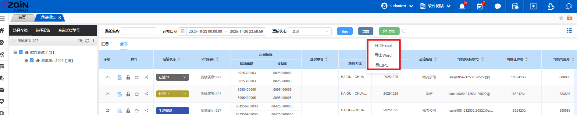 支持将调拨报告导出为多种格式,适配国际办公场景的数据归档与汇报需求。选中目标运单(支持批量选择),点击界面顶部「导出」按钮;