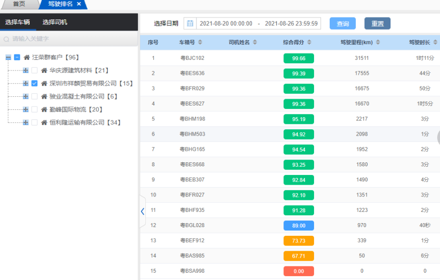 - 选择查询维度:根据管理需求选择 “司机” 或 “车辆” 作为排名维度;