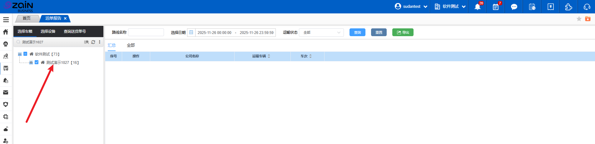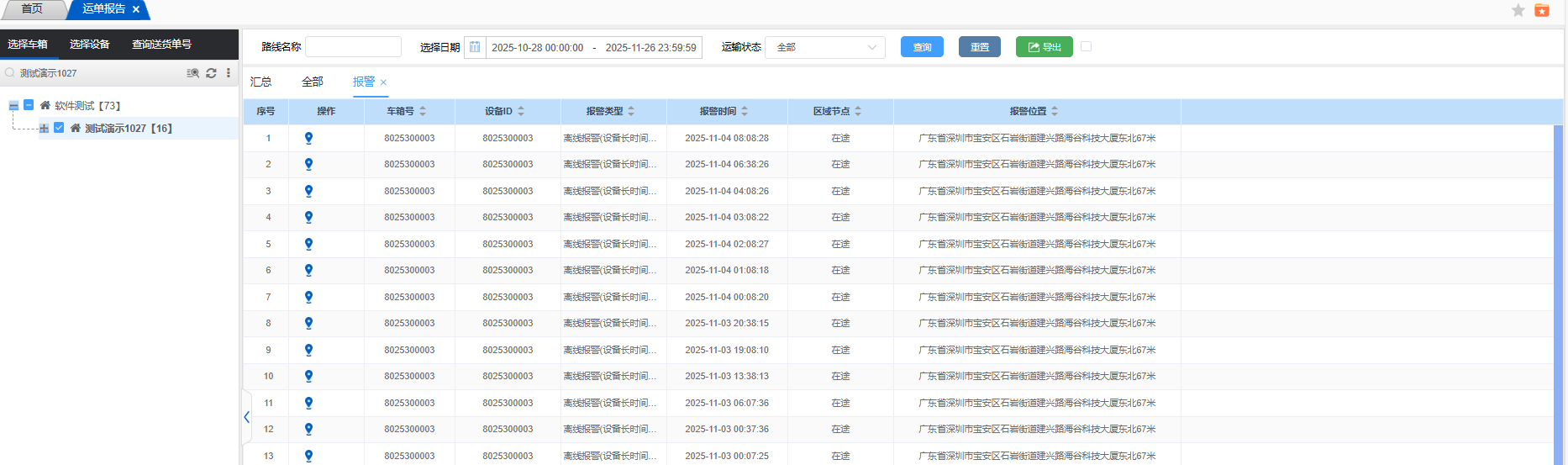快速检索:在顶部搜索框输入「公司名称」或「设备相关信息」(如设备 ID、车辆编号),系统自动模糊匹配,快速定位目标运单信息。