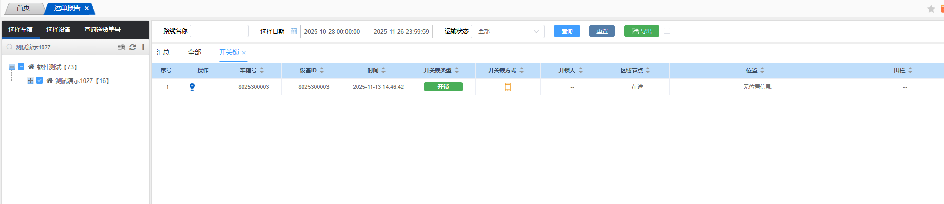 开关锁信息:切换至 “开关锁” 标签,查看运单执行过程中产生的所有开关锁记录,明确事件发生时间、类型及关联细节。