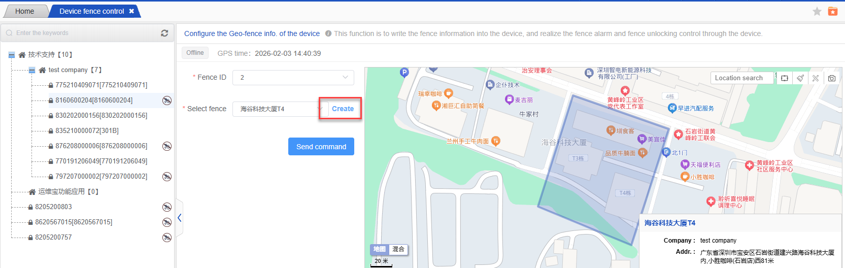 Select the device and the fence information to be bound, click the ‘Send command’ button, and interact with the device. Therefore, the device needs to be operated when the device is online. After the instruction is successfully sent, the fence information is written into the device;