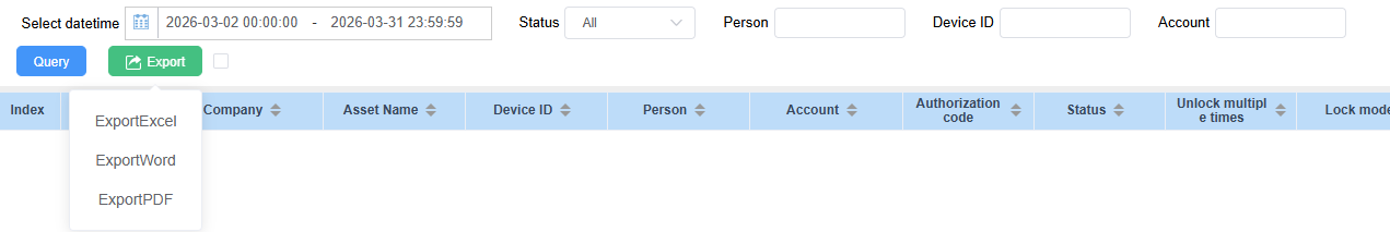 The authorization record is used to record the report of the unlocking records for the sub-lock and master-lock. When we have authorized unlocking in monitoring, Delivery list, or slave lock authorization in Commands–>Binding Slave Lock interface, we can view it in the authorization record after the authorization is successful.