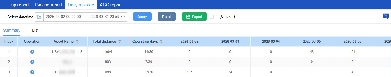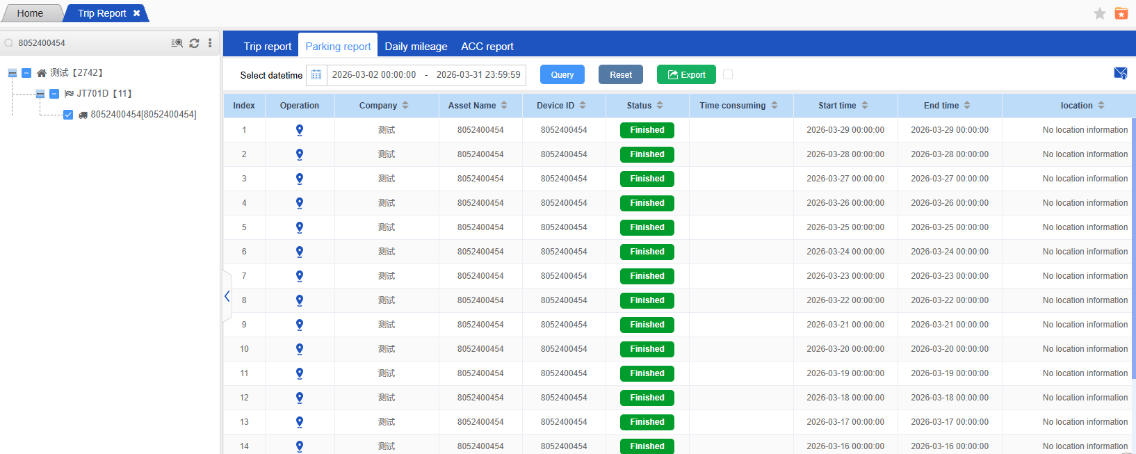 The ACC(Ignition) report is used to count the data during the period from ACC on to ACC off, including start time, end time, time consumption, continuous mileage, start position, and end position;