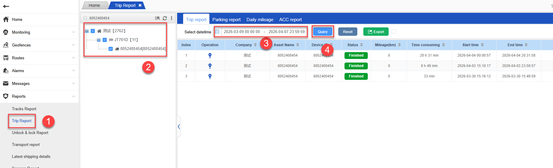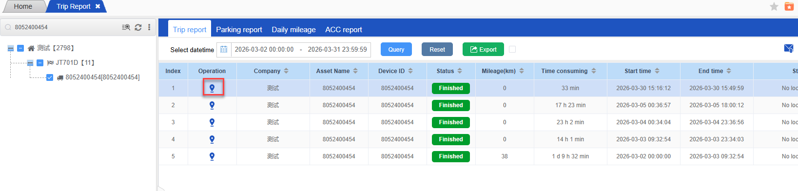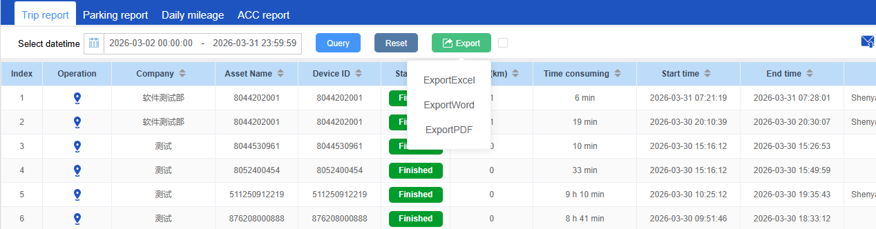 The Trip report is used to count the Trip report, parking report, Daily mileage and ACC report data of the vehicle. It is a comprehensive drving report for vehicle tracker device.Query the operation records of this account.