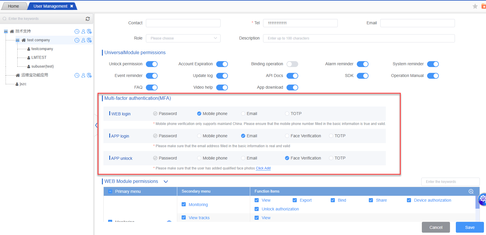 Divided into WEB permission configuration and APP permission configuration, the corresponding authority needs to be assigned according to the user’s role. After the user logs in to the Web based software or APP , only functional modules with authority are displayed. The module permissions are detailed down to each functional point, and the functional permissions are allocated according to the roles.