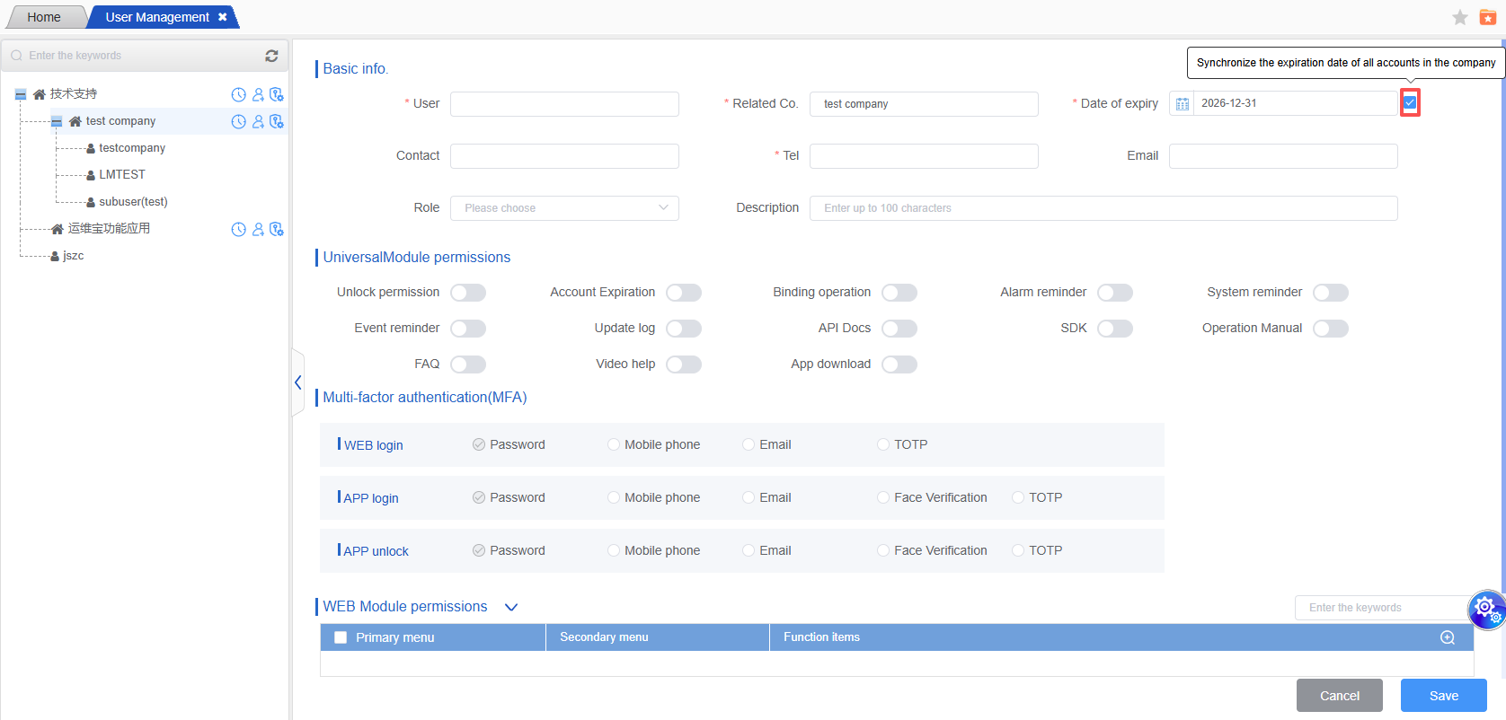 If you need to modify the expiration date, and you want to modify the expiration date of all accounts under the company simultaneously, you can tick the check box after the expiration date. After the save is successful, the expiration date of all accounts under the company’s name will be changed. Synchronization Update.