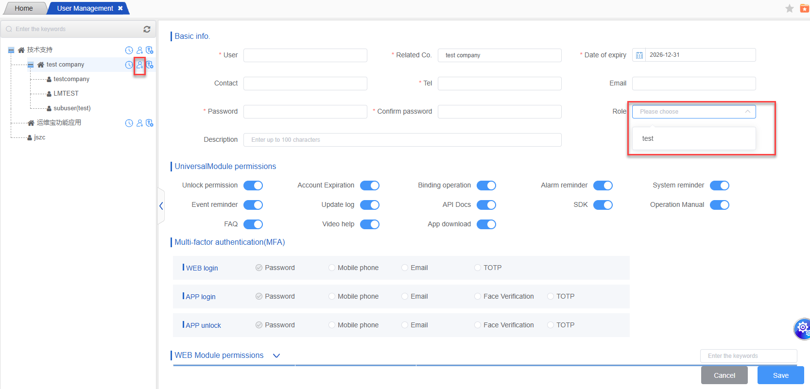 Enter user name, associated company, expiration date and other information, set function permissions and configuration module permissions. After the information is entered and confirmed, click Save to create a new account successfully and generate a new account, which will become the account of the current company.