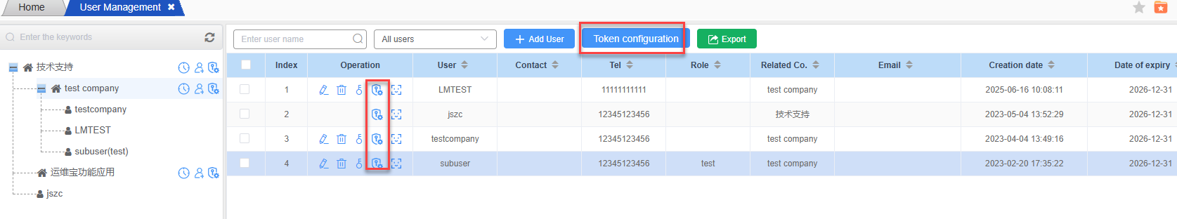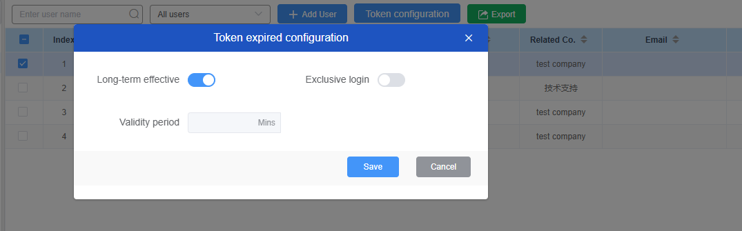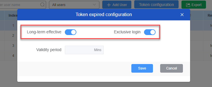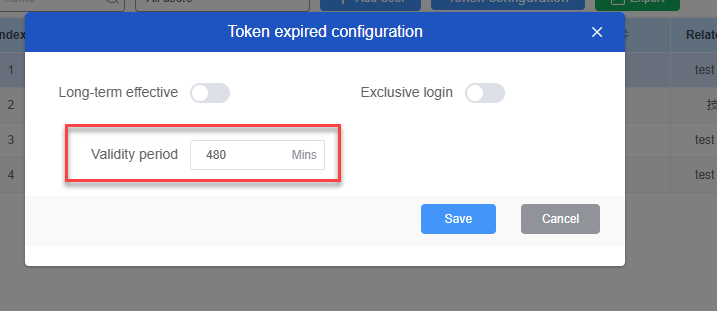 Locate the row of the user for whom the token expiration configuration is to be made. Click on the token shape icon (for token expiration configuration) in the “Operation” column. In the pop-up configuration window: