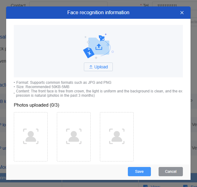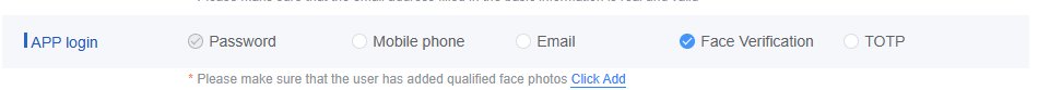 APP login verification; In the “APP Login Verification” area, you can choose “Email Verification” or “Face Recognition” methods, or you can leave all unchecked (the default is password login). If you choose “Face Recognition”, please ensure that the user has added a qualified face photo. If not, click “Click to Add” to proceed with the addition of the face photo.