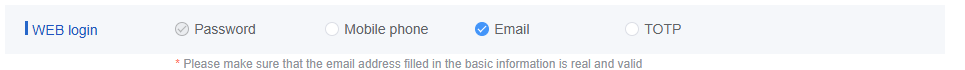 WEB login verification; In the “WEB login verification” area, you can choose the “email verification” method or not (the default is password login). If you choose “email verification”, please ensure that the email address filled in the basic information is truly valid so that you can receive the verification email normally.