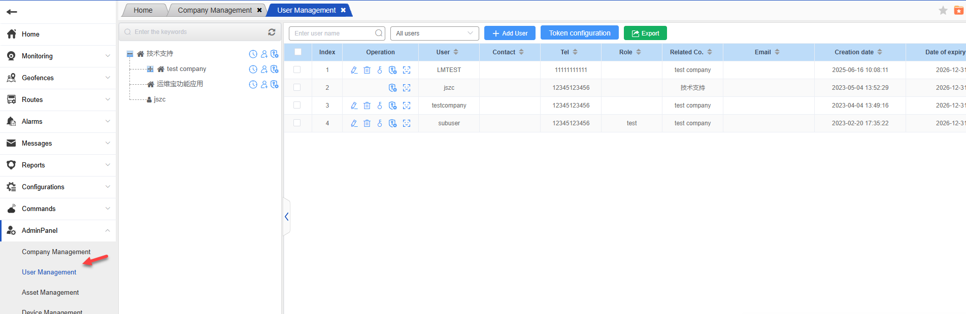 User management is used to maintain account information and authority management. The left side displays the users belonging to each company based on company information;