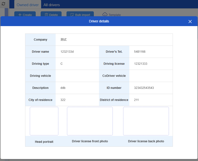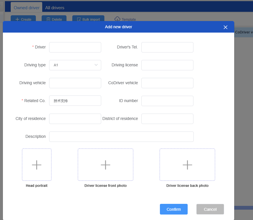 If you want to create new driver information for a company, select the company and click the “create” button to pop up a new page; if no company is selected, the default is to create new driver information for the current company;