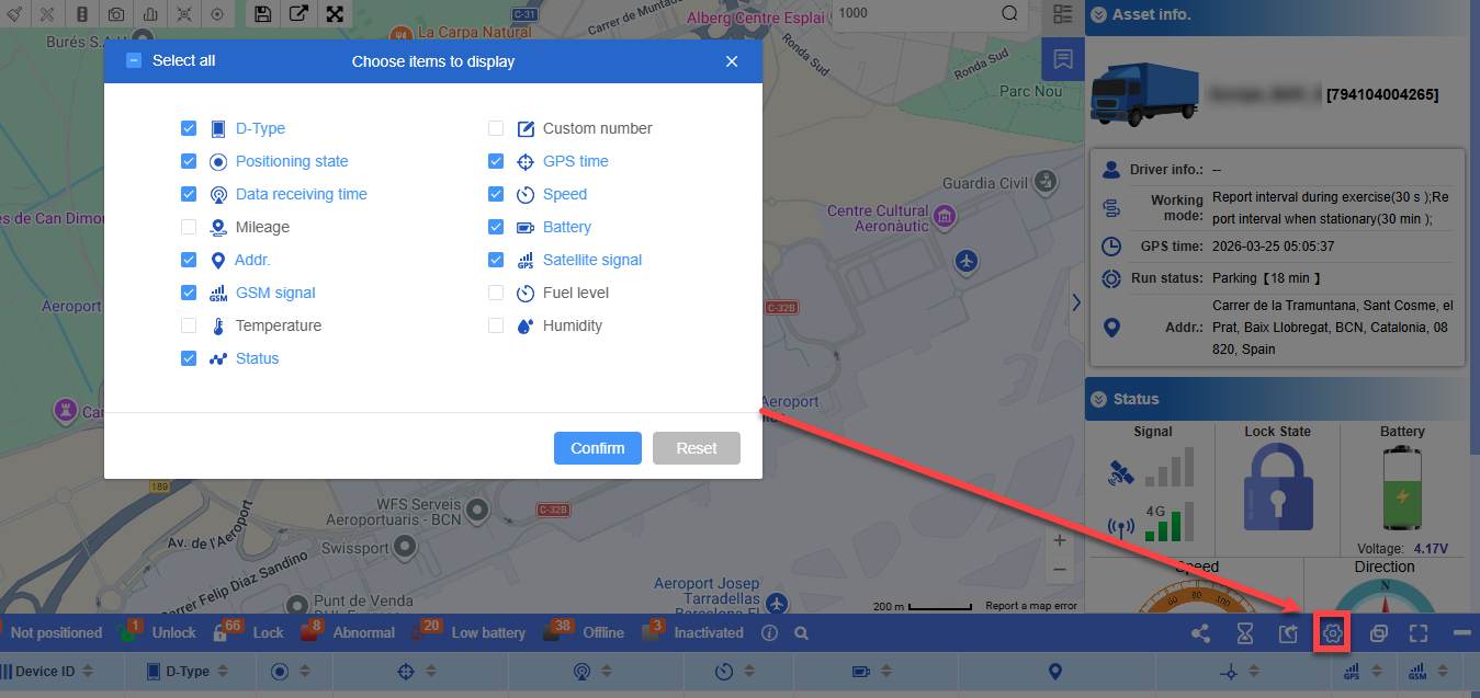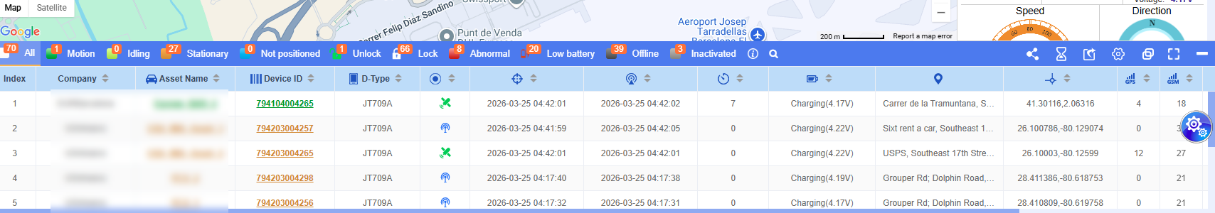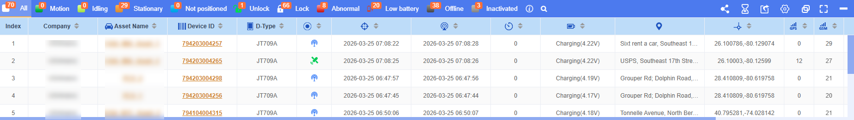 After selecting or checking the vehicle compartments (equipment) on the right side, the corresponding data will be displayed simultaneously in the bottom data column. The detailed data including company, asset name, device id, device type, and positioning status will be shown.
