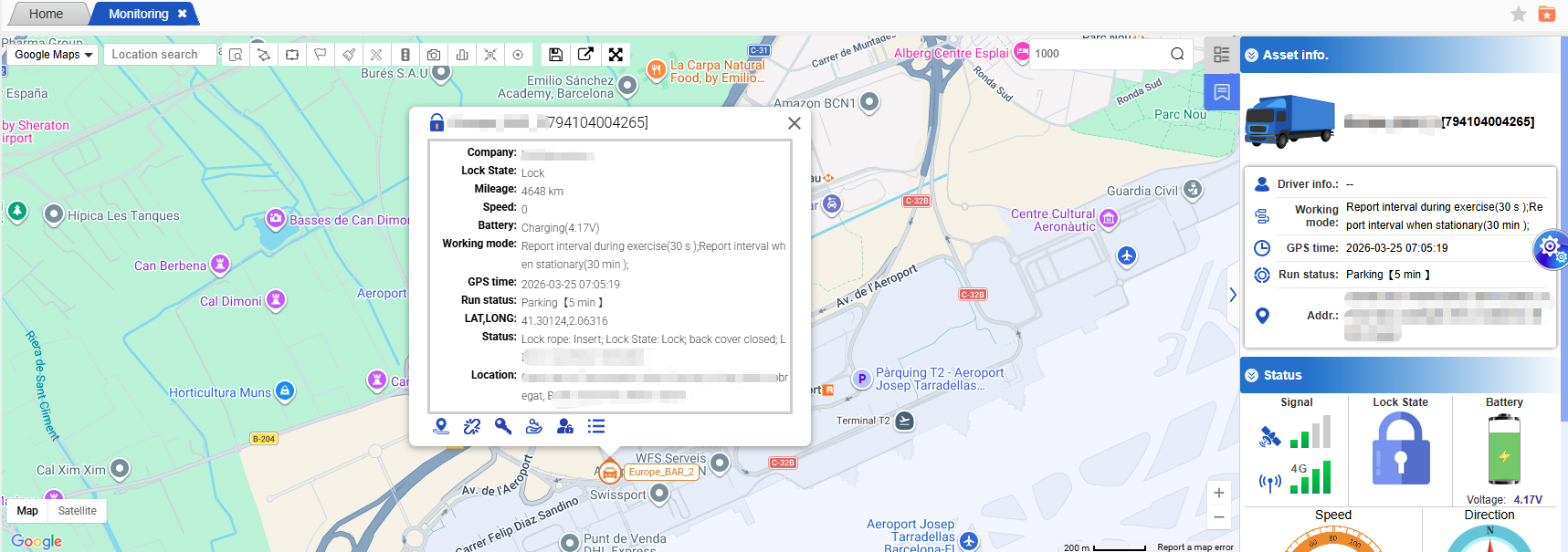 This area displays comprehensive information about the selected asset (such as a vehicle), including basic asset identification, operating status (GPS time, operating status, address), and status parameters (signal, lock status, power, speed, direction, etc.)