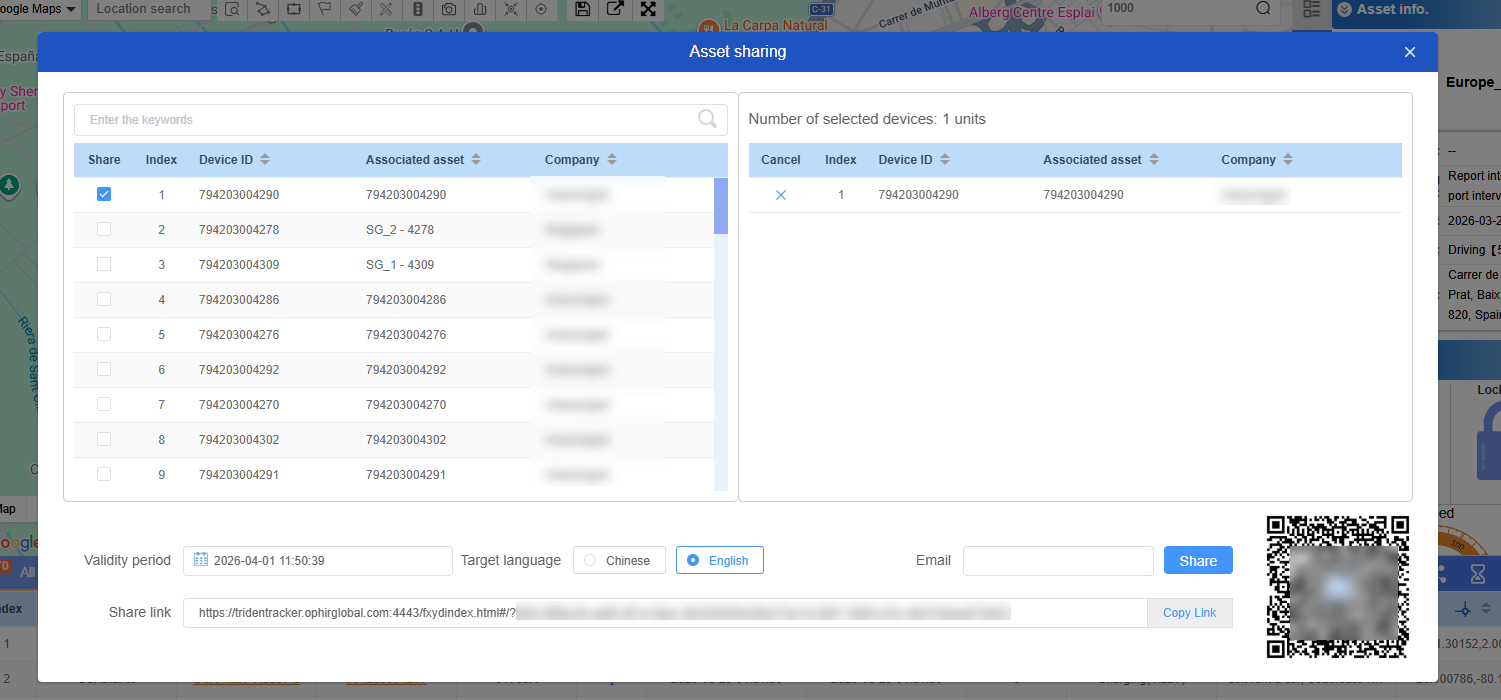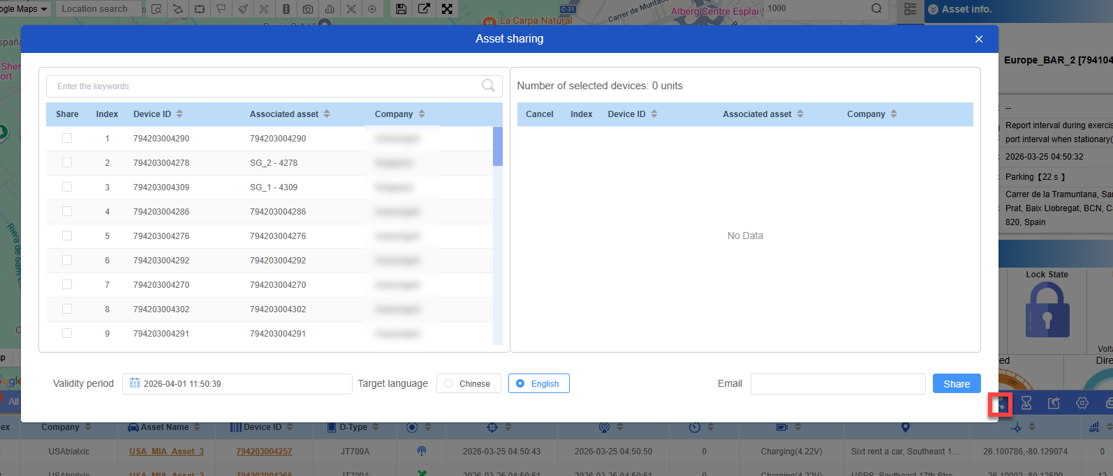 Click on the “Asset Sharing” option in the bottom data column. You can select one or more devices, and share the device data information with relevant personnel via email, link or QR code.