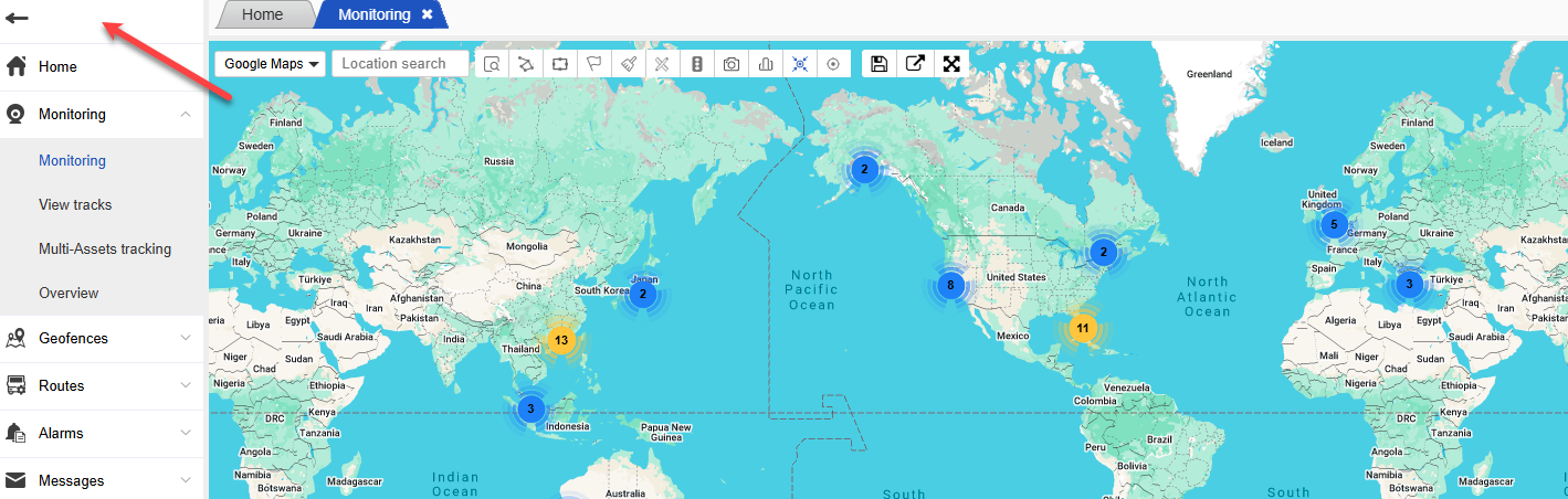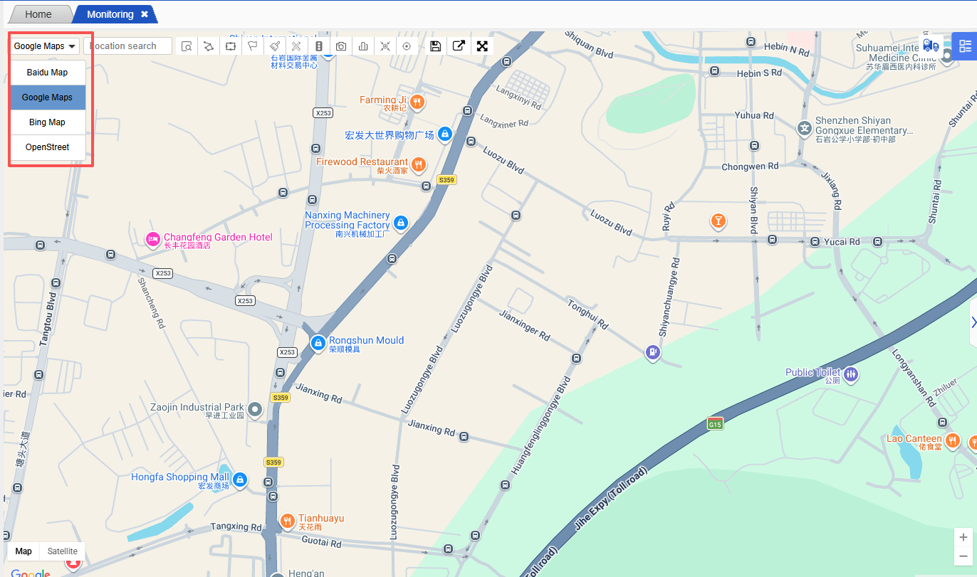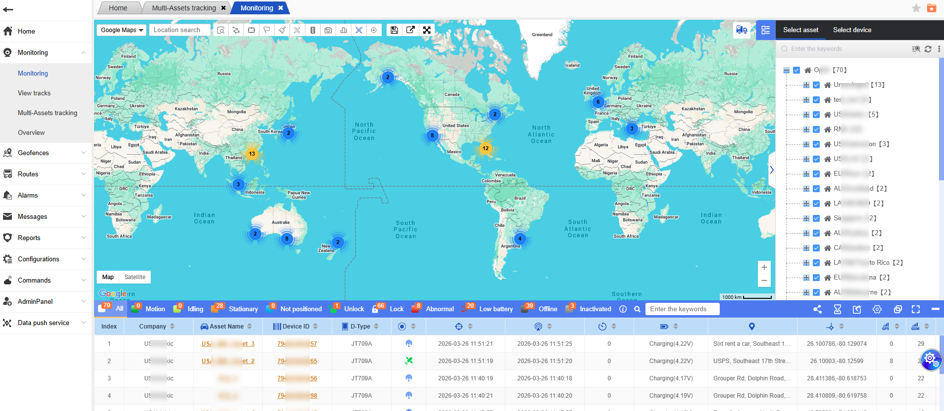 On the right is a assets tree, which displays the asset tree list of all companies that can be managed by the current account. Select a company, group or single asset can see the asset’s location information in real time on the map;