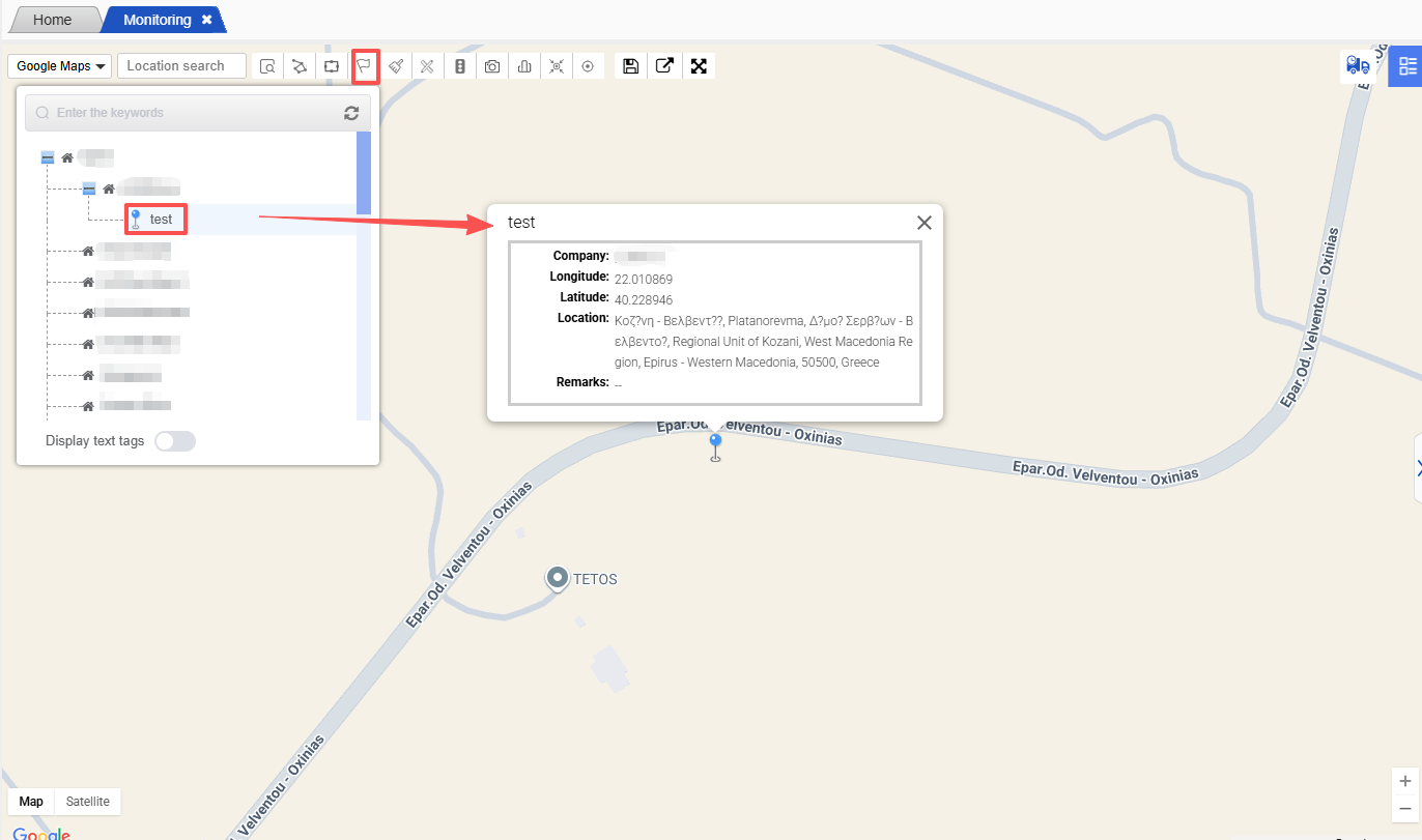 After clicking the “Show hotspot” button in the toolbar at the top of the map, select the hotspot name from the organization tree. The existing hotspot locations will be marked on the map (as shown in the “test” hotspot in the picture).