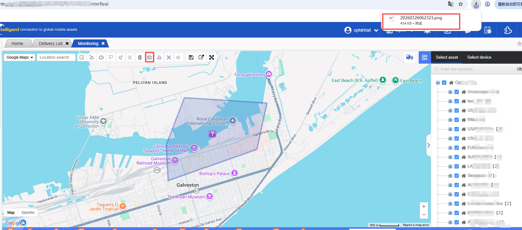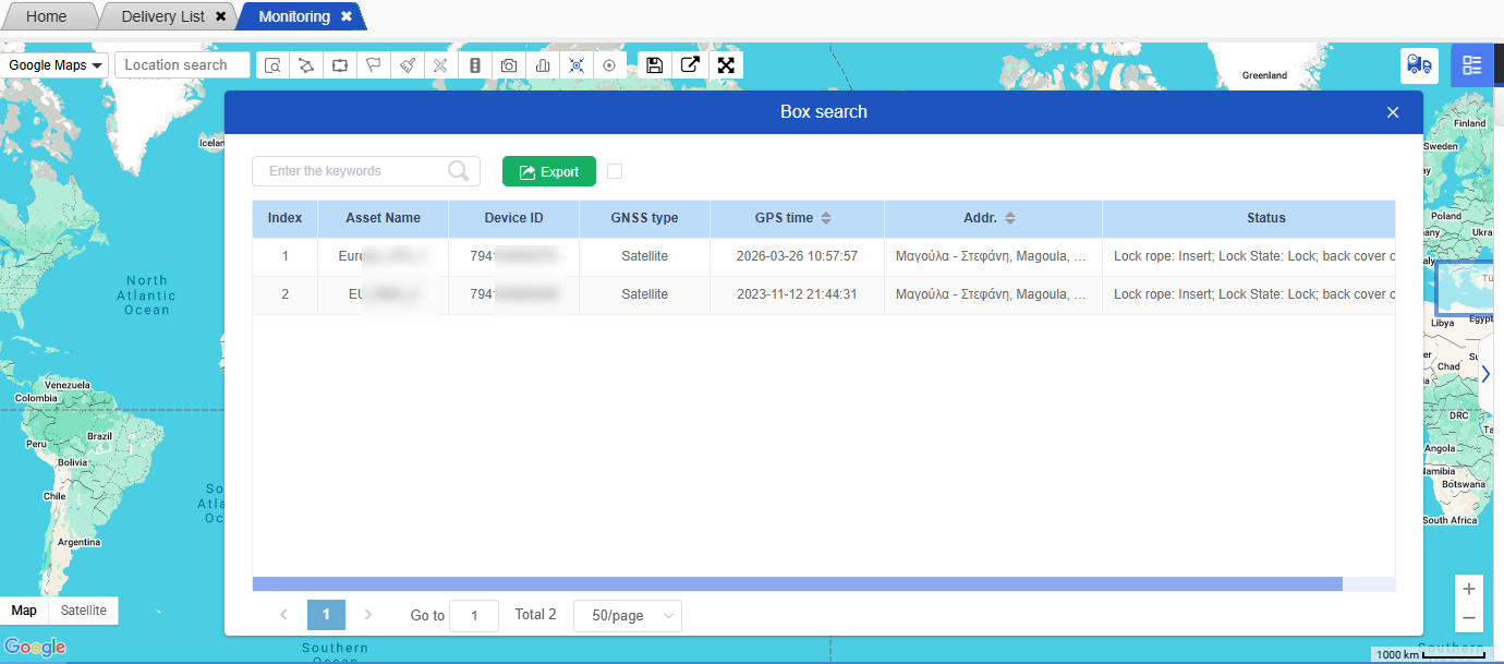 Users can enter the delivery number to interact with the asset filter search on the right. The delivery number comes from the chapter “Routes->Route Management”.