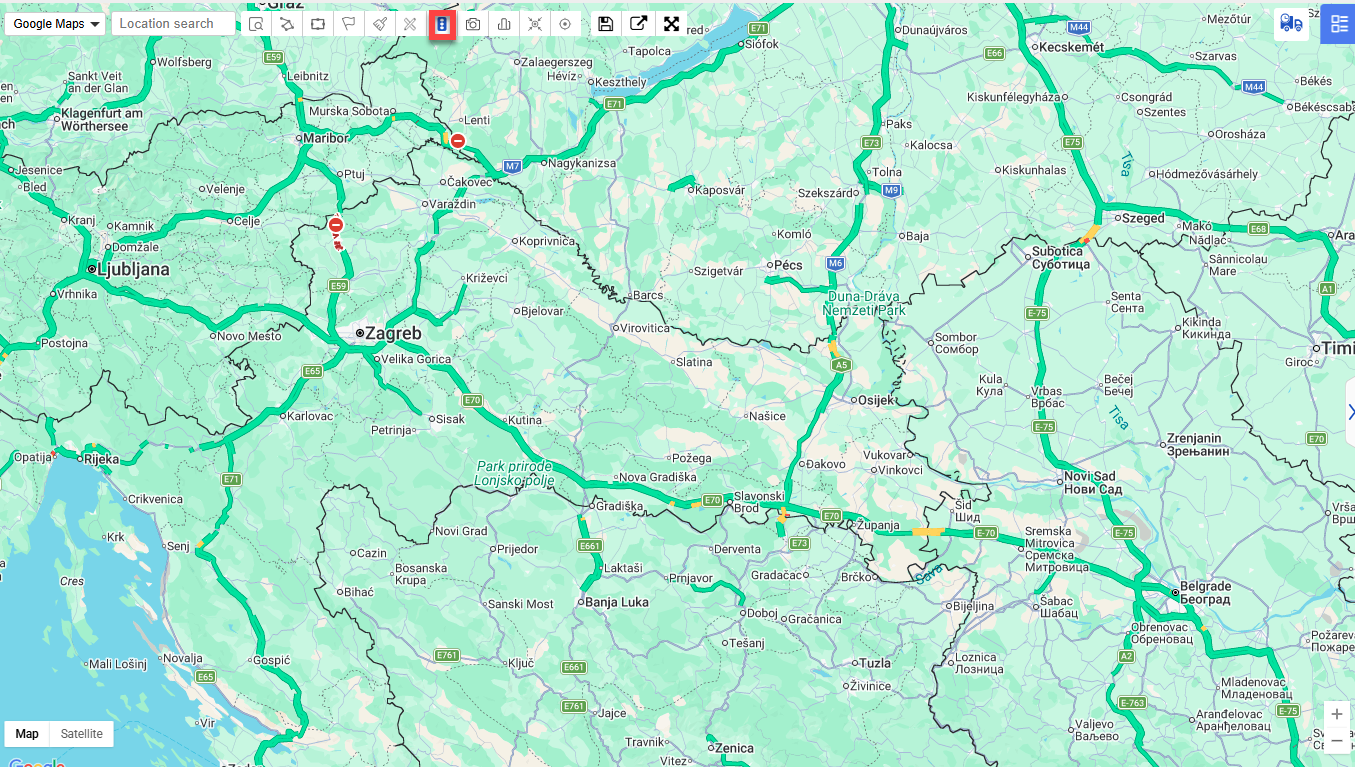Click the icon button marked “Road condition” on the toolbar above the map. The real-time traffic conditions of the roads will be displayed in different colors on the map. Green indicates smooth traffic, yellow indicates slow-moving vehicles, and red indicates traffic congestion.