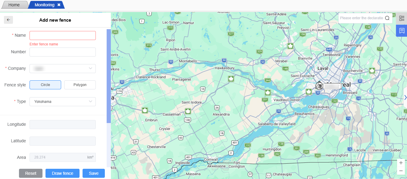 Click to enter the “Create a fence” interface; follow the prompts on the page to set the fence information. Once the fence is drawn successfully, you can choose to reset or redraw it.