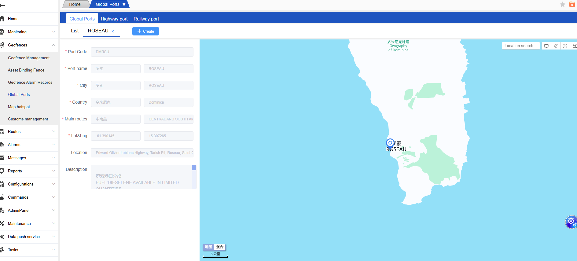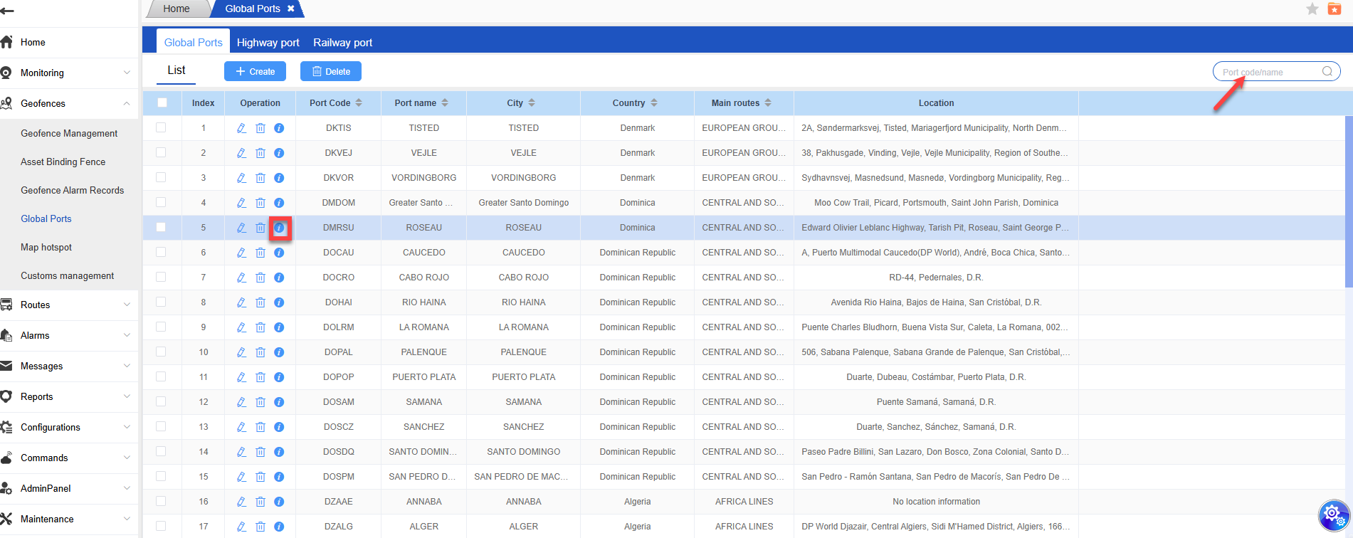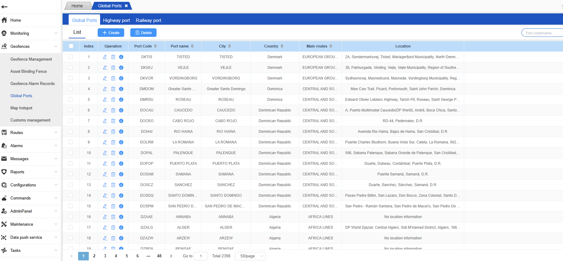 Global Port Function Displays global port information, information of road ports and railway ports. It supports adding, deleting and maintaining operations for various port information.