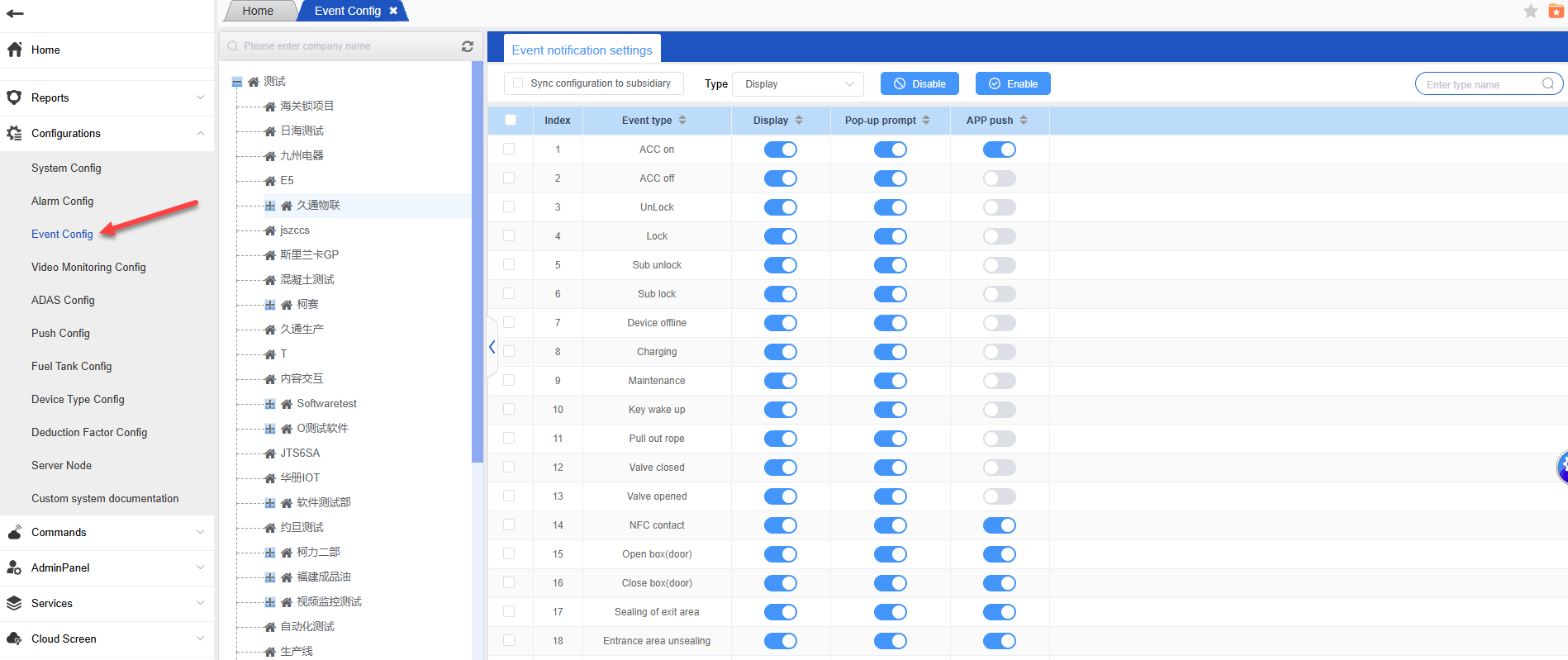 Event configuration is used to configure whether the events generated by each company need to be displayed, and if they need to be displayed, whether they need system pop-ups and APP push;