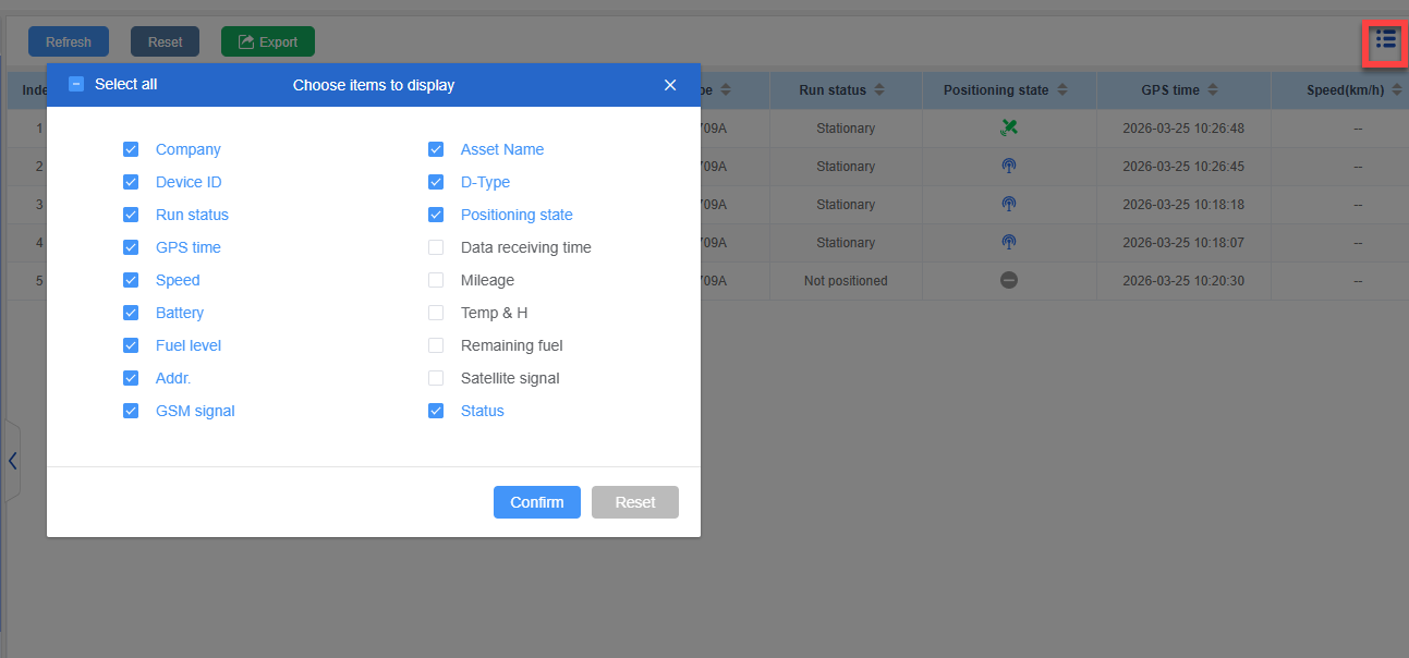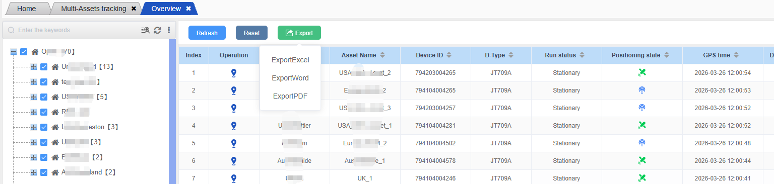 The overview table supports exporting the trajectory list to Excel, Word and PDF files for viewing, and it can also be exported based on the custom displayed fields. Simply click the corresponding export button, select the export format and the fields to be exported, and the data export operation can be completed.